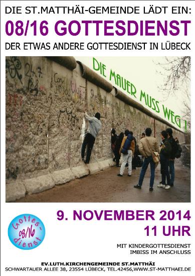 Zum 25. Jubiläum des Mauerfalls wird in der Lübecker St. Matthäi-Kirche in der Schwartauer Allee 38, am 9. November ab 11 Uhr, ein 08/16 Gottesdienst gefeiert. Seit mehr als 15 Jahren begeistert der 08/16 Gottesdienst seine Besucher durch seine unkonventionelle Form. Aufgespannte Segel und eine ansprechende Ausleuchtung setzen im Altarraum besondere Akzente. Mit Hilfe kurzen Spielszenen und Bildimpressionen sowie christlicher Popmusik soll an den Mauerfall vor 25 Jahren erinnert werden. Unter dem Titel „Die Mauer muss weg!“ findet dieses Ereignis den persönlichen Bezug zu den Besuchern. Denn Pastor Johannes Ströh und seinem Team aus 30 ehrenamtlichen Gemeindemitgliedern ist es wichtig, Themen mitten aus dem Leben aufzugreifen und sie aus Sicht des christlichen Glaubens zu beleuchten.