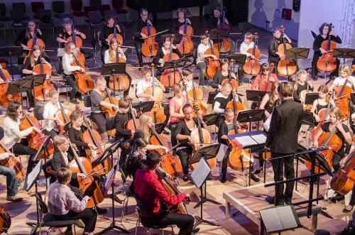 „100 Cellisten in Hamburg“ 2012 treten vor begeistertem Publikum im Miralles Saal auf.