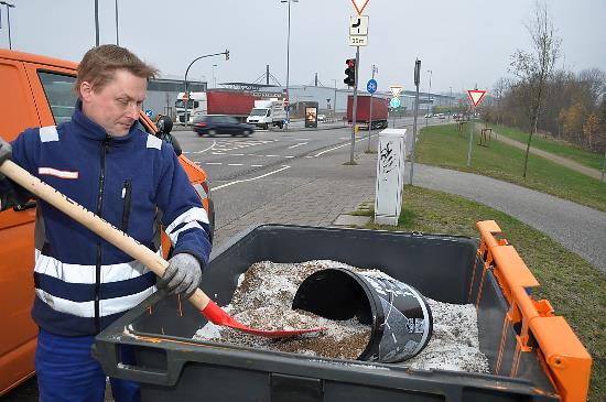 Streukaesten_Kroeger_0004Text und Fotos: TBF/Holger Kröger – Die Hansestadt Lübeck ist jetzt dabei, Streukästen in Lübeck aufzustellen. Hier sehen wir im Foto Thomas Marco, (Stadtmitarbeiter) beim Aufstellen der Kästen in der Hafenstraße.