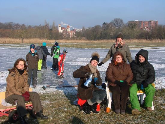 Fotos: TBF/Holger Kröger – Lübeck – Wie im Foto machen es die Eltern richtig. Sie gingen mit ihren Kindern zum Schlittschuhlaufen auf eine überflutete Wiese am Elbe-Lübeck Kanal an der Geniner Dorfstraße. Sie machten es sich dort auf den mitgebrachten Stühlen und Bänken mit heißen Getränken gemütlich. Eintritt kostet der ganze Spaß auch nicht und es ist sicher dort Schlittschuh zu laufen.