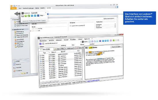 ok-Anwender – Lookeen 10.0: Die blitzschnelle Suchmaschine der neuesten Generation für Ihre kompletten Outlook/Exchange-Daten auf ihrem Rechner und finden soll das Programm, laut Softwareschmiede, eigentlich alles, was es an Daten gibt. Und dies, mit Google-Geschwindigkeit. Mit Lookeen 10 bekommen Sie Ihren kompletten E-Mail-Datenbestand in den Griff, auch die, auf ihrem Rechner, Laptop oder Tablet. Lookeen FINDET WIRKLICH ALLES, was Sie gespeichert haben: also nicht nur E-Mails, sondern auch Kontakte, Aufgaben, Termine – sogar die Inhalte von Mail- Anhängen in den häufigsten Dateiformaten (zum Beispiel Word- Dokumente, PDF-Dateien, Excel-Tabellen usw.) werden durchsucht, und, und, und.