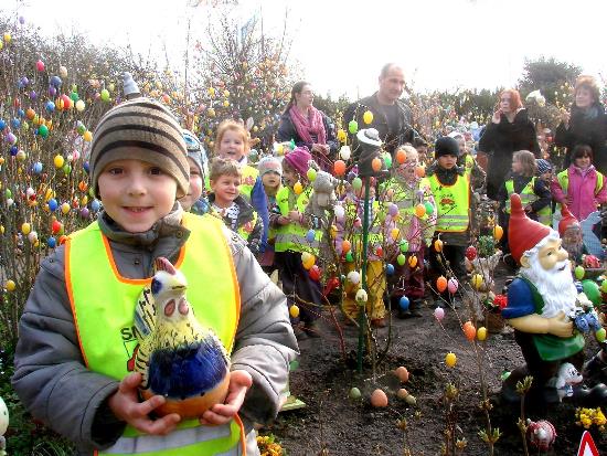 Text und Fotos: TBF/Holger Kröger – da staunten die 20 Kinder vom Kindergarten im Griechenzentrum in der Plönnistraße Lübeck nicht schlecht. Ca. 17.000 Ostereier schmücken den Kleingarten im Kleingartenverein Mühlentor e. V. in Lübeck von Gabriele Stammer und Thorsten Kups. Für die Kinder gab es dort viel zu entdecken. Osterhasen in allen Varianten und Größen.Frau Stammer sagte, dass schon des öfteren Kindergartengruppen ihren Ostergarten besucht haben. Die Kinder freuen sich und haben dann zu Hause viel zu erzählen.