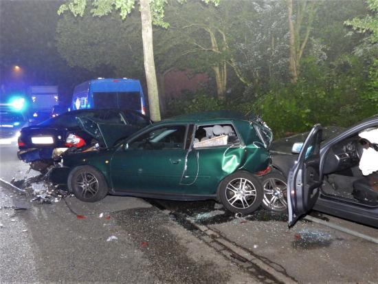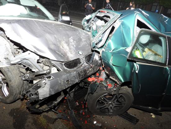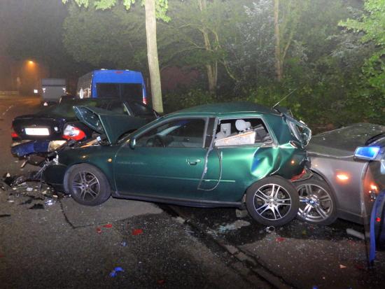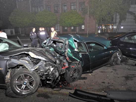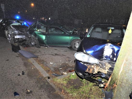 Text und Fotos: TBF/Holger Kröger – 19-Jähriger schrottet betrunken Sonntagmorgen in der Ziegelstrasse drei Autos · Der Junge Mann hatte sein Fahrzeug nicht mehr unter Kontrolle und fuhr drei Autos schrottreif, zerstörte ein Fußgängerleitgitter und beschädigte einen Baum. Eine Bilanz, die erschreckt!Der Betrunkene raste durch Lübeck in Richtung Buntekuhweg und kam mit seinem Auto in Höhe der Bushaltestelle Beethovenstraße in einer Kurve von der Fahrbahn ab. Dabei überfuhr er das neben der Bushaltestelle angebrachte Fußgängergitter, bevor er ungebremst in einen auf dem Parkstreifen abgestellten Audi krachte. Der Aufprall war so stark, dass der Audi auf einen vor ihm stehenden Ford aus dem Kreis Ostholstein krachte und gegen einen Baum schleuderte.