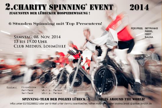 Flyer zu Event 2014„Das Spinning Team der Polizei Lübeck veranstaltet am Samstag, den 8. November 2014 ab 13 Uhr, ein sechsstündiges Spinning Charity Event im Club Medius, Lübeck, Bei der Lohmühle 88. Nach dem großen Erfolg der ersten Veranstaltung 2013 hatte man sich schnell entschlossen, die Veranstaltung zu wiederholen. Letztes Jahr floss nicht nur eine Menge Schweiß, sondern auch viel Geld in die Spendenkasse (1.400 Euro).  Die Startgelder kommen auch dieses Jahr wieder ausnahmslos der Hospizbewegung Lübeck zugute.Insgesamt liegen über 80 Anmeldungen vor, somit ist die Veranstaltung schon jetzt komplett ausgebucht. Die symbolische Übergabe des gespendeten Geldes in Form eines Schecks übernimmt gegen 19.00 Uhr der Schirmherr der Veranstaltung, der Leitende Polizeidirektor der PD Lübeck, Herr Heiko Hüttmann.