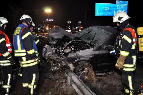 Spektakulärer Unfall auf A1 bei Lübeck – Fahrer entkommt zum Glück leicht verletzt -Feuer kann von Feuerwehr eingedämmt werden – Opel Astra völlig zerstört