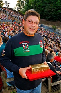 Mit einem Goldschatz überraschten die Karl-May-Spiele Bad Segeberg am Samstagabend den 200.000 Besucher der diesjährigen Inszenierung “Der Ölprinz”. Vier Gangster der Karl-May-Spiele brachten dem 200 000. Besucher den Gewinn in einer großen Kiste auf die Bühne des Freilichttheaters. Die Geschäftsführerin der Karl-May-Spiele, Ute Thienel, überreichte dem überraschten Jens Tönsfeuerborn (37) aus Bondelum (Nordfriesland) symbolisch einen übergroßen Goldbarren. Mit nach Hause nehmen konnte er drei Goldbarren á 20 g im Gesamtwert von rund 2.500 €.