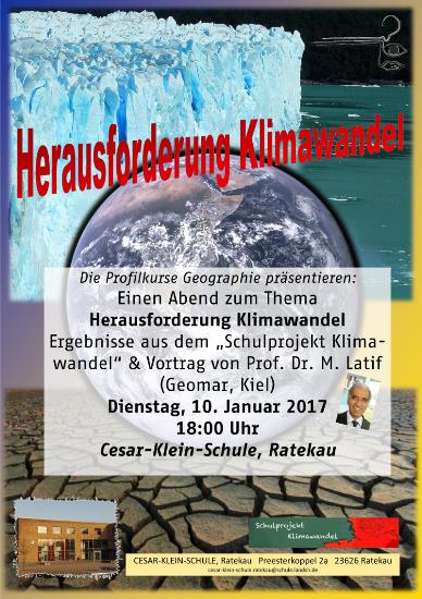 An der Cesar-Klein-Schule nehmen wir uns dieses Themas an und bearbeiten es seit nunmehr drei Jahren vertiefend im Unterricht des Profilfaches Geographie im Jahrgang der Einführungsphase. Die Schülerinnen und Schüler erschließen sich in eine Projektphase ein Themenbereich, werden zu „Experten“ in ihrem Gebiet und erstellen eine Arbeit, die an die Methodik des wissenschaftlichen Arbeitens an Universitäten angelehnt ist. Eine Präsentation ausgewählter Arbeit in der Universität Hamburg vor großem Publikum bildet das Ende der Projektphase. Um das „Schulprojekt Klimawandel“ einer breiteren Öffentlichkeit vorzustellen und ausgewählte Ergebnisse zu präsentieren, laden wir herzlich zu einem Abend zum Thema: „Herausforderung Klimawandel“ am Dienstag, den 10.1.2017 um 18:00 Uhr ein. Im Anschluss an die Beiträge von Schülerinnen und Schülern wird der Hauptvortrag von Professor Mojib Latif gehalten.