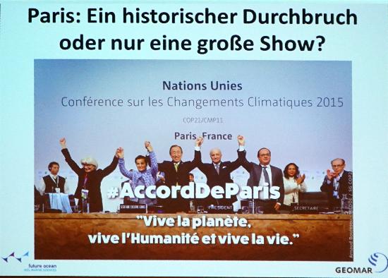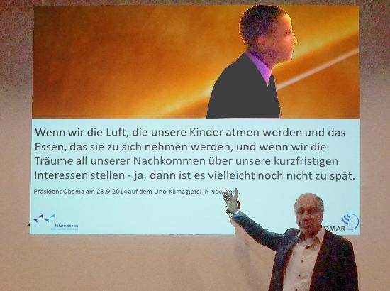 Nach der Podiumsdiskussion begann Latif seinen einstündigen Vortrag, in dem er nachwies, dass schon im 19. Jahr Klimaforscher nachwiesen, dass die Co2-Anreicherung der Luft mit der Klimaveränderung einhergeht. In seinen Schlussworten zierte er den Scheidenden Präsidenten der USA, Barak Oma: „Wenn wir die Luift, die Kinder atmen und das Essen, das sie zu sich nehmen werden, und wenn wir die Träume all unserer Nachkommen über unsere kurzfristigen Interessen stellen ja, dann ist es vielleicht noch nicht zu spät.“
