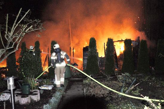 300917_Feuer Dornbreite _Kroeger_002Fotos: TBF/Holger Kröger · Gegen 19.40 Uhr wurde im Bereich des Geländes Herrengarten an der Dornbreite ein Feuer gemeldet. Dort brannte eine große Laube lichterloh. Für die Feuerwehr ersteinmal ein Problem: Die Feuerwehrmänner musste eine Wasserversorgung über eine längere Strecke aufbauen. Fotogalerie siehe Seite 2 >>>>Nach 40 Minuten war das Feuer in Gewalt, gegen 21 Uhr konnten die Berufsfeuerwehr und die Freiwilligen Feuerwehren Buntekuh/Padelügge und Schönböcken wieder einrücken.