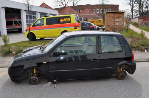 Ihr VW Polo wurde mit Steinen aufgebockt. Der Wagenheber der oder des Täters wurde zurückgelassen. Da die Steine, mit dem der Wagen aufgebockt war zusammengebrochen sind, liegt der Wagen mit den Achsen auf der Fahrbahn und kann nicht mehr mit dem Wagenheber angehoben werden.
