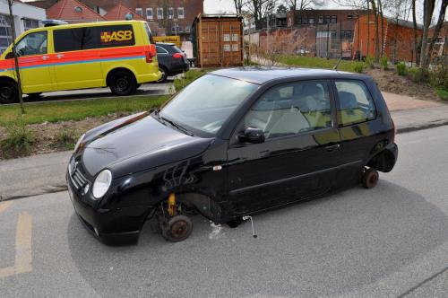 Text und Fotos: TBF/Holger Kröger – Eine Mitarbeiterin des Arbeiter-Samariter-Bundes in der Hoeschstrasse traute ihren Augen nicht, als sie in der früh nach ihrer Nachtschicht nach Hause fahren wollte. Alle 4 Autoreifen incl. teurer Felgen wurden in der Nacht direkt vor dem ASB gestohlen.