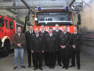 Im Foto von links nach rechts: Nils Osterhoff (direkt von der Arbeit), Kjell Schalnat, Wolfgang Dunker, Carlo Hölterling, Tanja Lucht, Marco Sindt, Rudi Boss, Jens Grahlmann. – Der Ortswehrführer Wolfgang Dunker hat im November die Mitglieder der Freiwilligen Feuerwehr Bad Schwartau zu einer außerordentlichen Mitgliederversammlung eingeladen. Diese Sitzung wurde erforderlich, da es in der Gruppenführung drei vakante Positionen zu besetzen galt.