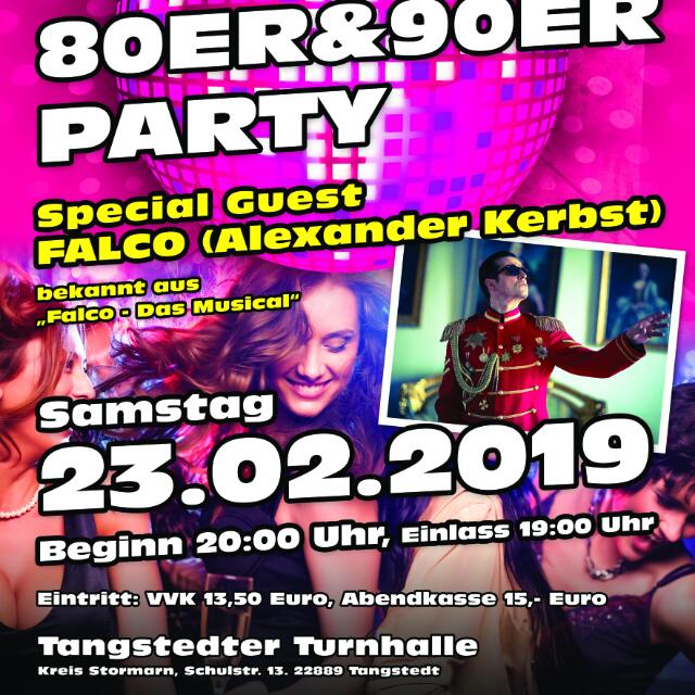 80ger/90ger Party in 22889 Tangstedt bei Norderstedt · Text und Fotos: TBF/Holger Kasnitz – Es war eine Super-Veranstaltung in der Turnhalle, Schulstraße 13. Die Veranstalter Bianca und Jens Kleinschmidt präsentierte bei der “80ger/90ger Party“ als Stargast Alexander Kerbst, den Hauptdarsteller von FALCO – Das Musical. Die Gäste waren schon gut in Stimmung als um 22.00 Uhr FALCO-Darsteller-Alexander Kerbst die Halle betrat. (Siehe Bildergalerie Seite 2) >>>>>Mit seiner zum Verwechseln ähnlichen FALCO-Stimme kamen aus seiner Kehle die bekannten FALCO-Songs “Der Kommissar“,“ Jeanny“ , “Out oft the Dark“,“ Rock me Amadeus“ und viele weitere Songs. Das Publikum tanzte und sang und rief immer wieder nach Zugaben. Alexander Kerbst erfüllte die Musikwünsche, mischte sich unter das Volk und nach seinem Auftritt gab er Autogramme und er ließ sich mit den Veranstaltungsbesuchern fotografieren. Für Essen und Getränke hatten die Veranstalter Bianca und Jens Kleinschmidt auch gesorgt und der DJ Maik Schulze machte Musik bis in den frühen Morgen. Party, Party, Party.