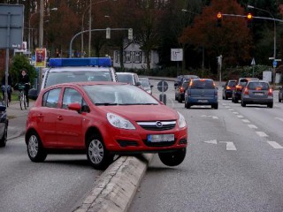 Text und Fotos: TBF/Holger Kröger – Eine 84 jährige Rentnerin fuhr gestern gegen 14:30 Uhr vom Parkplatz des Wirth-Centers auf die Ratzeburger Allee. Dort hätte sie nur rechts stadteinwärts abbiegen können. Sie fuhr aber geradeaus über einen 40 cm hohen Betonbegrenzungsstreifen, der sich auf der Ratzeburger Allee befindet.Ihr Opel Corsa blieb hängen. Das Vorderrad hing in der Luft. Der Wagen konnte weder vor noch zurück bewegt werden. Erst ein Abschleppunternehmen konnte den Wagen aus seiner mißlichen Lage befreien. Die alte Dame beobachtete die Bergungsarbeiten vom Streifenwagen aus und freute sich, dass es alles so schön geklappt hatte.