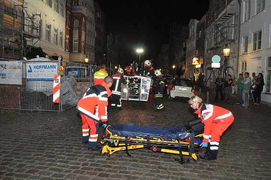 Text und Fotos: TBF/Holger Kröger – Lübeck, Samstagfrüh, 31.08.2013 : Anwohner hörten einen Mann um Hilfe rufen und stellten fest, dass dieser zwischen zwei Altstadthäuseren im Dachbereich fest hing. Gegen 2:12 Uhr wurde Lübecks Feuerwehr in die Engelsgrube gerufen. Die Feuerwehr erreichte den Mann mit einem Rettungskorb und sicherte ihn zunächst mit einem Tau, damit er nicht weiter in die Schlucht der engen Häuser nach unten rutschen konnte.