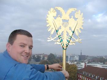 Aufwendig wurde der metallene Greifvogel von Henning Junghans restauriert und neu mit Blattgold versehen. Er kann aus einem reichen Erfahrungsschatz schöpfen, schließlich wurde u.a. der Holstentor-Adler von Junghans neu hergestellt und vergoldet.