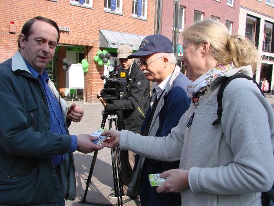Fotos: TBF/Holger Kröger – Heute wurden wieder Korane in Lübeck von Muslimen und den Salafisten verteilt, es sollen bundesweit 25 Millionen von ihnen unter die Leute gebracht werden. Darum startete die Freie Bibelgemeinde Lübeck die Aktion „Kontrapunkt: Bibel“ und verteilt das Neue Testament mit Psalmen in der Fußgängerzone in Lübeck. Nach Meinung der Freie Bibelgemeinde, dient die Verteilung mehr zur Erinnerung an das Evangelium, als zur massiven Verbreitung der Bibel, denn diese stehen zu Millionen in den Schränken vieler Bürger und verstauben leider oft. Selbst viele Muslime liessen sich auf ein Gespräch mit den Christen ein und nahmen Gottes Wort, das neue Testament entgegen. Ein Kontrapunkt ist in der Musik eine Gegenstimme zum aktuellen Hauptthema. In diesem Fall ist das Hauptthema der Diskussion z.Zt. in den Medien die Verteilung des Koran. Ralf Hilgerdenaar, Gemeindemitglied der Freien bibelgemeinde: „Wir wünschen uns, das sich jeder, der einen Koran entgegen nimmt, auch die Möglichkeit nutzt, diese Schrift mit dem Wort unseres HERRN, Jesus Christus, zu vergleichen, das in der Bibel verkündet wird. Deshalb verteilen wir heute das Neue Testament mit den Psalmen. Wem das noch nicht ausreicht, der kann in der Freien Bibel Gemeinde eine vollständige Bibel bekommen.“