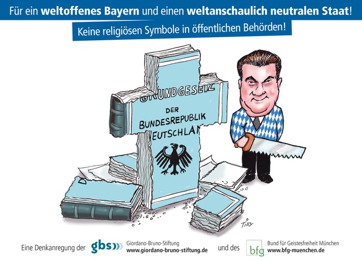 München (ots) – Pünktlich zum Inkrafttreten der neuen Kreuz-Verordnung in Bayern am Freitag, dem 1. Juni 2018, veranstalten die Giordano-Bruno-Stiftung (gbs) und der Bund für Geistesfreiheit (bfg) einen „Aktionstag für ein weltoffenes Bayern und einen weltanschaulich neutralen Staat“. Der Düsseldorfer Künstler Jacques Tilly hat hierzu eine Karikatur von Markus Söder gezeichnet, der mit einer Säge das deutsche Grundgesetzbuch auf Kreuzform zurückgeschnitten hat. Am Wochenende wird das Söder-Plakat in München vielerorts zu sehen sein. Die von der gbs unterstützte Aktionsgruppe „Das 11. Gebot“ wird am Freitag mit dem Plakat sowie der Skulptur „Der Quengel-Bischof“ durch die Fußgängerzone ziehen, während ein PR-Car mit dem Söder-Plakat von Freitag bis Dienstag durch die Münchener Innenstadt fahren und an symbolträchtigen Orten haltmachen wird. Für Presseanfragen und Fotos gibt es am Freitag folgende Gelegenheiten: 09:30 Uhr: Marienplatz/Dienerstraße 13:30 Uhr: Max-Joseph-Platz/Residenzstraße 14.00 Uhr: Hofgarten/Bayerische Staatskanzlei 17:00 Uhr: Marienplatz/Dienerstraße Bei dem Termin um 14.00 Uhr an der Bayerischen Staatskanzlei soll dem bayerischen Ministerpräsidenten ein besonderes Präsent überreicht werden. Ob Markus Söder der Einladung folgen und die angebotene Möglichkeit zur Aussprache nutzen wird, ist nicht bekannt. Die Veranstalter des Aktionstages, der bfg München, der bfg Bayern und die Giordano-Bruno-Stiftung, hatten den Beschluss des bayerischen Ministerpräsidenten, Kreuze in den öffentlichen Einrichtungen seines Landes aufzuhängen, bereits im April als „klaren Verstoß gegen das Gebot der weltanschaulichen Neutralität“ kritisiert. gbs-Vorstandssprecher Michael Schmidt-Salomon sprach in diesem Zusammenhang von einem „Verfassungsbruch, den wir nicht klaglos hinnehmen werden! (…) Wir werden die entsprechenden Verfahren mit unseren erfahrenen Juristinnen und Juristen vom Institut für Weltanschauungsrecht (ifw) begleiten und es wird uns eine Freude sein, die Prinzipien des liberalen Rechtsstaats gegen Söders Rechtspopulismus ins Feld zu führen.“ Weitere Informationen und Materialien zum Aktionstag unter: https://www.giordano-bruno-stiftung.de/meldung/kreuz-mit-soeder Pressekontakt: c/o Elke Held, https://www.giordano-bruno-stiftung.de/impressum Original-Content von: Giordano Bruno Stiftung, übermittelt durch news aktuell