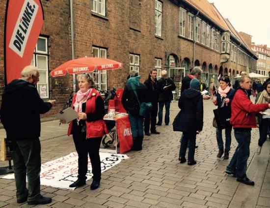 Die Lübecker LINKE beteiligte sich am globalen Aktionstag gegen TTIP, CETA, TiSA & Co. – kurz die geplanten Freihandelsabkommen dieser Tage. In der Erklärung der Bundespartei heißt es dazu:TTIP wäre das größte Geschenk der Politik an die Konzerne und das Ende der Demokratie, wie wir sie kennen. Selbstverständliche Standards für Lebensmittel, Umwelt, Beschäftigung, öffentliche Dienste – mit TTIP wird die Welt auf den Kopf gestellt.In TTIP und CETA, aber auch in einem bislang wenig beachteten Sonderabkommen über den Handel mit Dienstleistungen (TISA) soll auch die öffentliche Daseinsvorsorge den Regeln des Marktes unterworfen werden. Wenn einmal privatisierte Stadtwerke, Krankenhäuser oder die Abfallentsorgung wieder in kommunales Eigentum übertragen werden sollen, können private Anbieter dagegen klagen – mit der Begründung der „Diskriminierung“.Die Mehrheit der Bürgerinnen und Bürger in Deutschland ist gegen TTIP – sie lassen sich nicht für dumm verkaufen. Die Versprechen der TTIP-Lobby von Wohlstand und Jobs für alle sind auf Sand gebaut, glaubhafte Berechnungen gibt es nicht. Trotz massiver Proteste gehen die Verhandlungen zwischen den USA und der EU in der kommenden Woche in eine nächste Runde. Die EU-Kommission und die deutsche Bundesregierung verhöhnen die Demokratie, indem sie den Willen der Bürgerinnen und Bürger missachten.