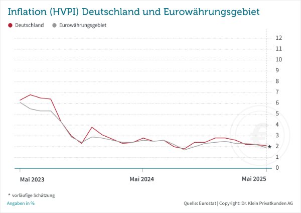Anfang März sowie die rückläufige Inflationsentwicklung. Sie lag laut dem statistischen Amt der Europäischen Union, Eurostat, im Mai vorläufig bei 2,1 Prozent in Deutschland und bei 1,9 Prozent im Euro-Währungsraum.