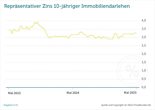 war nach Trumps Ankündigung zunächst leicht gefallen, nach der anschließend mit der EU ausgehandelten Fristverlängerung bis zum 9. Juli dann wieder etwas gestiegen – die Bauzinsen zogen entsprechend nach“, erklärt Pfaffinger. Aktuell beträgt der repräsentative Zins von Dr. Klein für eine 10-jährige Baufinanzierung 3,26 Prozent (Stand: 03.06.2025).