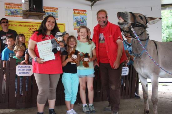 In diesem Jahr können alle, auch Erwachsene, mitmachen. Die Siegerprämie beträgt 1000 Euro! die 15. Vorrunde gewann Ingrid Kimmich aus Hamburg. Sie hatte zusammen mit Ihrer Familie 2 Wochen im Eselpark Urlaub gemacht und tüchtig geübt. Cäsar hat ihr dann auch geantwortet. Den zweiten Platz errang Felicia Urmann aus Dortmund vor Sarah Kirsch aus Bremen.1973 bis 2014 – Über 40 Jahre Eselpark Nessendorf – Jeden Samstag von 10 – 12 Uhr freier Eintritt für 2 – 3 Kinder in Begleitung eines Erwachsenen Besucher, die mit dem Fahrrad anfahren, haben freien Eintritt. Jeden Samstag 10 – 18 Uhr: Motorradtreffen – Motorradfahrer haben freien Eintritt.
