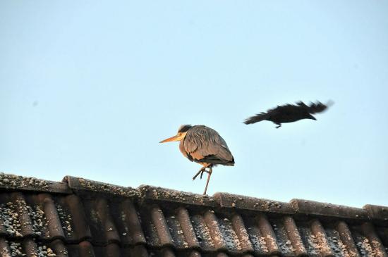 tbf150218_Graureiher_Kasnitz_005Text und Fotos: Holger Kasnitz – Graureiher auf dem Dach in Lübeck, Westhoffstraße 91/93 nahe Bei der Lohmühle. Sitz doch am frühen Morgen ein Graureiher auf dem Hausdach gegenüber meiner Wohnung. Meine Fotoapparat hatte ich griffbereit und machte einige Aufnahmen. Morgens um Sieben ist die Welt noch in Ordnung, dachte ich. Es sitzen immer viele verschiedene Vögel auf dem Dach, doch einen Graureiher hatte ich dort noch nie gesehen. Bildergalerie Seite 2 >>>>Er stand auf einem Bein in der Morgensonne. Dann kamen einige Raben dazu. Sie hüpften auf dem Hausdach hin und her. Der größere Vogel schien ihnen nicht zugefallen und Näherten sie sich dem Kollegen. Ein Rabe von links und einer von rechts.