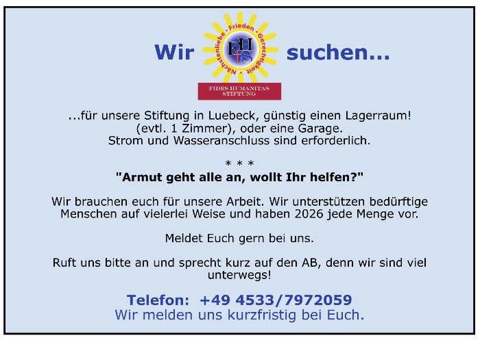 Anzeige: Gesuch für einen Raum, oder Garage und Helfer für die Fides Humanitas Stiftung