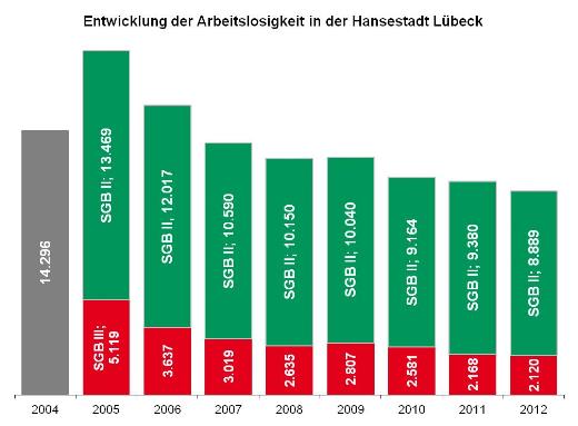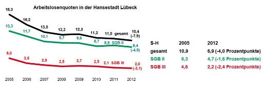 Die Arbeitslosenquote auf Basis aller zivilen Erwerbspersonen fiel im Jahresdurchschnitt 2012 um 0,6 Prozentpunkte auf 10,4 Prozent. Damit bleibt sie höher als die Quote des Agenturbezirkes (8,5 Prozent), von Schleswig-Holstein (6,9 Prozent) und vom Bundesgebiet (6,8 Prozent). Im September ist die Quote in der Hansestadt erstmals nach 20 Jahren wieder unter 10 Prozent gesunken ist. Im Oktober hatte die Hansestadt sogar die niedrigste Quote der vier Städte in Schleswig-Holstein, während es vor vier Jahren noch die höchste war.