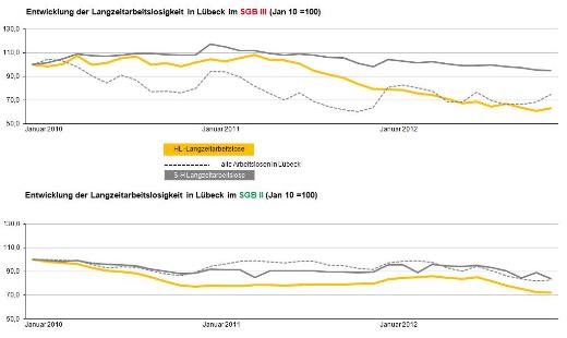 Die Arbeitslosenquote der von der Arbeitsagentur betreuten Arbeitnehmer ging um 0,1 Prozentpunkte auf 2,0 Prozent zurück. Die Quote der Kunden des Jobcenter Lübeck ging dagegen um 0,5 Prozentpunkte auf 8,4 Prozent zurück. Beide Arbeitslosenquoten sind seit 2005 stärker zurückgegangen als in Schleswig-Holstein.