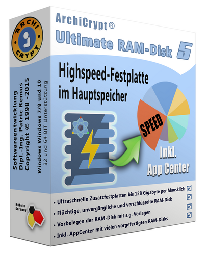 Egal, welche Aufgaben man am Rechner erledigen will – stets ist dafür ein Zugriff auf die Festplatte nötig. Bei langsamen Festplatten kann es einige Zeit dauern, bis die gewünschten Programme endlich starten. ArchiCrypt Ultimate RAM-Disk schafft hier durch eine clevere Technologie ganz leicht Abhilfe: Das Programm verwandelt den ungenutzten Teil des Hauptspeichers in ein sogenanntes RAM-Laufwerk. Dieses RAM-Laufwerk lässt sich wie ein ganz normales Laufwerk nutzen, bietet jedoch eine deutlich höhere Zugriffsgeschwindigkeit. Sogar Solid State Disk (SSDs) können hier von der Geschwindigkeit her nicht mithalten.