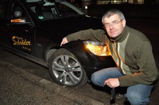 Fotos: TBF/Holger Kröger – In der Posener Strasse in Lübeck wurde gestern gegen 22 Uhr ein Fahrschulwagen dadurch erheblich beschädigt, dass der Wagen in ein großes Schlagloch geriet und der Reifen platzte. Ob weitere Beschädigungen an der Achse eingetreten sind, muß noch geklärt werden. Gerhard Jeschull, Fahrer des Wagens:„Es ist unglaublich, wie unsere strassen aussehen. Ich werde die Hansestadt Lübeck auf Schadensersatz verklagen. Wir zahlen Steuergelder, die auch für den Strassenbau und Strassenreparaturen ausgegenben werden müssen.“