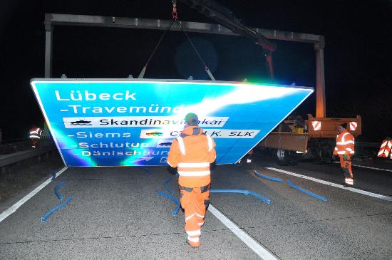 Text und Fotos: TBF/Holger Kröger – Bad Schwartau: Autobahn A1 gestern Nacht gesperrt – Gestern Abend 19 Uhr bis Sonntagfrüh gegen 6 Uhr wurde die Autobahn in Fahrtrichtung Fehmarn zwischen der Anschlussstelle Bad Schwartau und dem Autobahndreieck Bad Schwartau A 1/A 226 für den Verkehr gesperrt.Eine 20 Meter lange Schilderbrücke wurde mit einem Kran abmontiert und auf der Autobahn zerlegt. Der Ablauf verlief reibungslos. Der Verkehr wurde von der Autobahn abgeleitet. Verkehrsstaus blieben aus. Die Schilder-Stahlbrücke wurde mit einem Schneidbrenner am Boden zerlegt und auf einem Tieflader abtransportiert. Die Hinweisschilder werden bei der Autobahnmeisterei eingelagert.