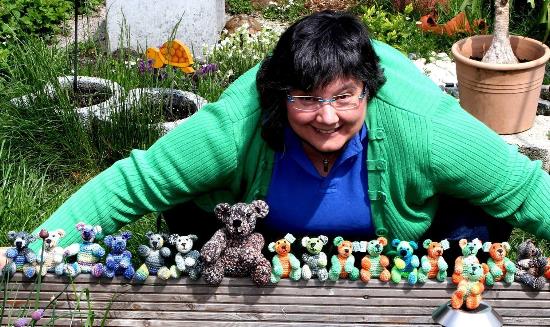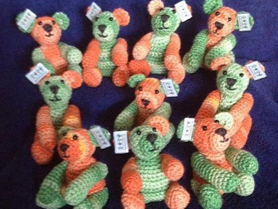 Zur gleichen Zeit hatte mich ein ehemaliger Klassenkamerad über Facebook angeschrieben. Er hatte die ersten Fotos meiner Bären gesehen und bestellte spontan gleich 10 Stück. Er hat eine Firma und möchte die Bären gerne in den Firmenfarben, natürlich für den guten Zweck verlosen. Ich freute mich, aber mir wurde immer mehr bewusst, dass ich alleine mit der Produktion überfordert bin, da jeder Bär seine Herstellungszeit braucht. Sie sind ja alle mit Sorgfalt gemacht und jeder ein Unikat. Keiner wird gleich, selbst wenn sie aus der gleichen Wolle gehäkelt sind. Ich marschierte los Wolle und Füllmaterial besorgen und sprach meine Schwägerin an und hoffte auf Hilfe. Natürlich fragte ich auch Freundinnen und meine Töchter. Inzwischen häkeln wir zu sechst und ich bin sehr stolz darauf, dass meine Aktion so angenommen wird. Jeder ist mit Freude dabei.