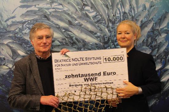 Foto in der Anlage: Bodo Fabian (l.), Vorstandsvorsitzender der Beatrice Nolte Stiftung, überreicht einen Scheck über EUR 10.000 zugunsten des Projekts „Bergung von Geisternetzen“ an Claudia Marloh vom WWF (r.) (Foto: WWF / BNS)
