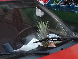 Heute liess er sich etwas anderes einfallen…Ich fand hinter dem Scheibenwischer eine „lebende Gurke“. Ja nicht wirklich lebendig, aber ein niedlich gemaltes Gesicht auf der Gurke erinnert natürlich an einen Menschen, oder aber, zumindest an einen Spassvogel.