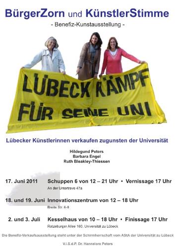 Die Lübecker Künstlerinnen Hildegund Peters, Barbara Engel und Ruth Bleakley-Thiessen haben die Stimmungen und den Zorn der Lübecker Bürger während der Protest- und Kampfphase aufgegriffen und sich spielerisch mit Bildung, Politikern und Menschen in Schleswig-Holstein auseinandergesetzt. Die Kunstwerke sollen zugunsten des Studienfonds der Universität zu Lübeck im Rahmen der Ausstellung verkauft werden.