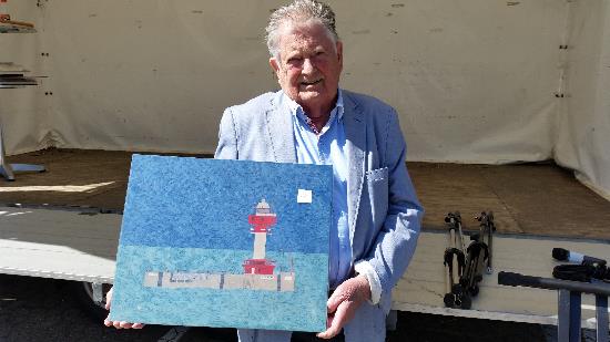 Gerd Newiger, hält eine Intarsienarbeit des Leuchtturms der Lotsenstation in der Kieler Förde in seinen Händen. Seine Idee war es, vor 50 Jahren, den Leuchtturm aus Aluminium bauen zulassen. Für Verpflegung und Getränke, sorgten Moni und Heidi.