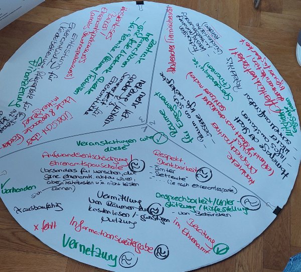 Der Grund dieser mehrfachen Versuche, so verstand ich es, sollte die Wünsche der Teilnehmer noch mehr bündeln und konkretisieren, was die Veranstaltungen von ePunkt und der Stadt für die Ehrenamtlichen besser bzw. förderwürdiger machen könnten. Auch diese Ergebnisse wurden zusammengefaßt und wieder von gewählten der Tische dem Podium vorgetragen.