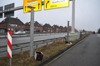 Fotos: TBF/Holger Kröger – Heute wurden  von 2 Personen ungeliebte Blitzer an der B75 Travemünder Landstrasse in Fahrtrichtung Travemünde zerstört. Darunter waren auch 2 Blitzatrappen. Die demolierten Blitzer wurden eingesammelt, die Suche nach den Tätern läuft, doch das Aufsprüren dürfte sicherlich sehr schwierig werden.
