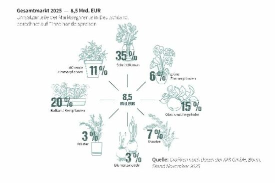 Nach Schätzungen der Agrarmarkt Informations-Gesellschaft mbH (AMI) auf Basis der ersten drei Quartale 2025 schrumpfte der Markt für Blumen & Zierpflanzen im Jahr 2025 auf ein Niveau von 8,5 Mrd. Euro (zu Einzelhandelspreisen).