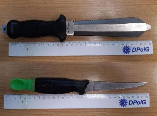 Bei der anschließenden Durchsuchung des Mannes wurde am Gürtel ein Holster mit einem 30 cm langen Filetiermesser(13 cm Klingenlänge)gefunden. An seiner Wade trug der Mann ein 30 cm langes Tauchermesser (18 cm Klingenlänge) und in seiner Hosentasche noch zwei Taschenmesser. Zur weiteren Bearbeitung des Sachverhaltes wurde er mit zur Dienststelle am Bahnhof Lübeck genommen.