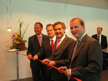 BU: V. l.: Klaus Kannen (Vorstand Dr. Klein), Ronald Slabke (Aufsichtsrat Dr. Klein), Bürgermeister Bernd Saxe, Stephan Gawarecki (Vorstand Dr. klein) beim Durchschneiden des roten Bandes anlässlich der Einweihung des neuen Standortes der Dr. Klein & Co AG im Hansekontor.