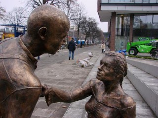 Foto: TBF/Holger Kröger – Die Fußgänger, die am Lübecker Kaufhof entlangschlendern, können immer noch über die Bronzefiguren, die dort aufgestellt sind, staunen. Der Lübecker Künstler und Bildhauer Sven Schöning schuf 13 lebensgroße Bronzeskulpturen, die nun am umgebauten Kaufhof auf Marli stehen. Die Figuren ziehen die Blicke der Passanten auf sich: „Die Wartenden“ Schöning sie genannt. Der 46-jährige Künstler den Großauftrag für die Wohnungsbaugenossenschaft Neue Lübecker nun fertig gestellt. „Miteinander“ heißt die Personengruppe aus Männern, Frauen und Kindern.