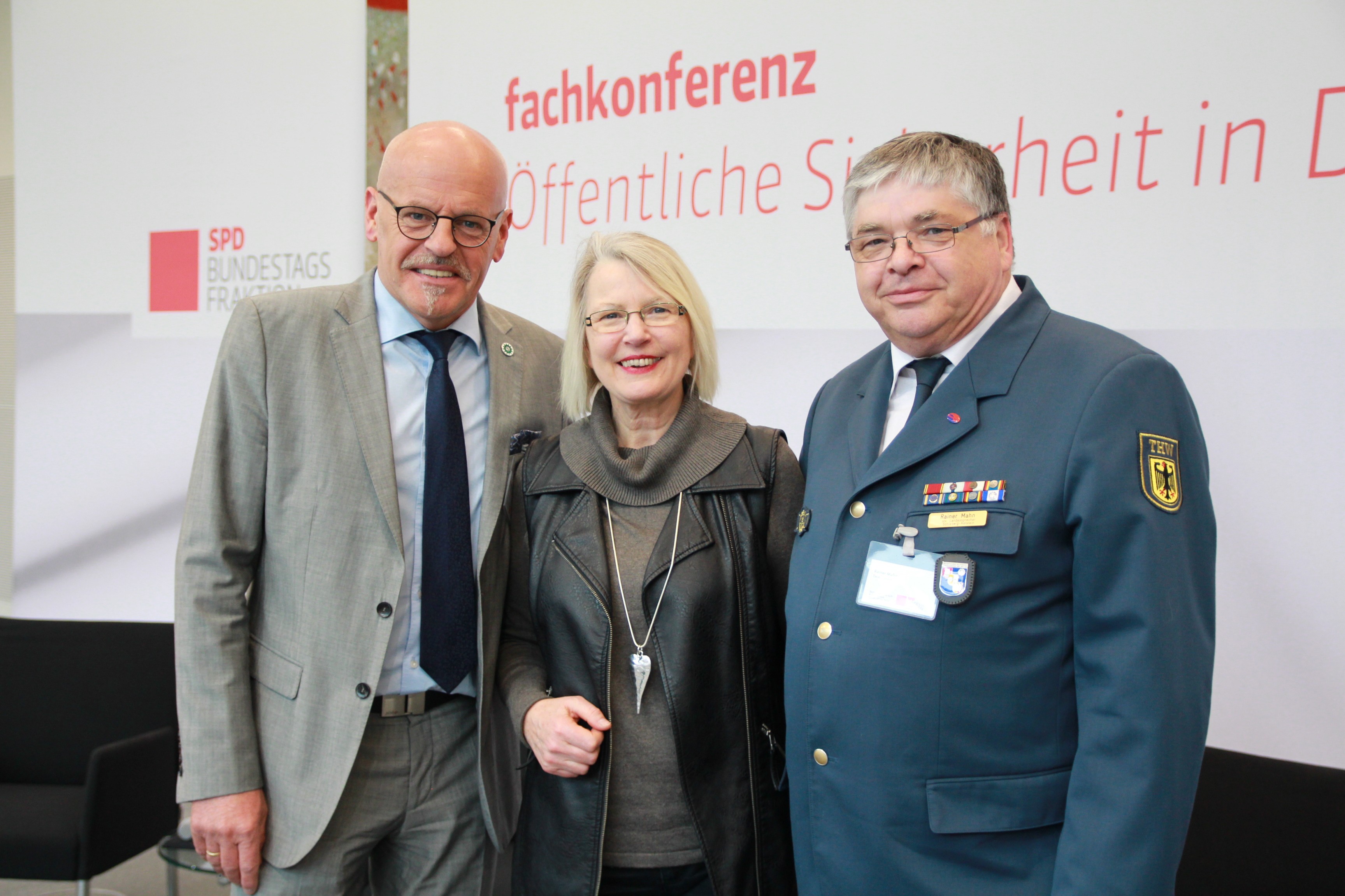Auf dem Foto (v.l.n.r.): Gabriele Hiller-Ohm, MdB (SPD) konnte auf der Sicherheitskonferenz der SPD-Bundestagsfraktion den Vorsitzenden der Gewerkschaft der Polizei (GdP) der Bundespolizeiakademie Lübeck, Rüdiger Maas, der auch Bundesvize der GdP Bezirk Bundespolizei ist, sowie den Ortsbeauftragten des THW Lübeck, Rainer Mahn, begrüßen.