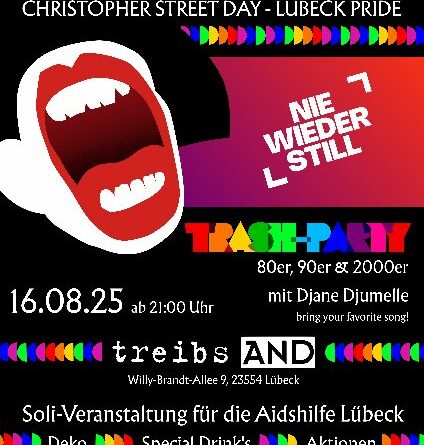 WeiterlesenSamstag, 16.08.2025 CSD Aftermove Soliparty für die AIDSHILFE Lübeck Ab 21 Uhr laden wir zum offiziellen Aftermove des Christopher Street
