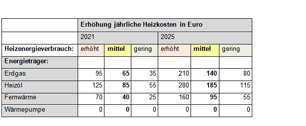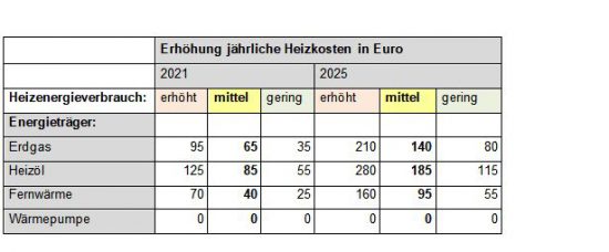 Zu Beginn beträgt der CO2-Preis 25 Euro pro Tonne CO2. In der 70 Quadratmeter großen Beispielwohnung im Mehrfamilienhaus mit Erdgas-Zentralheizung steigen die jährlichen Heizkosten damit im Schnitt um 65 Euro. In Häusern mit Heizöl-Heizungen werden Bewohner der Beispielwohnung 85 Euro mehr zahlen, bei Fernwärme 40 Euro.