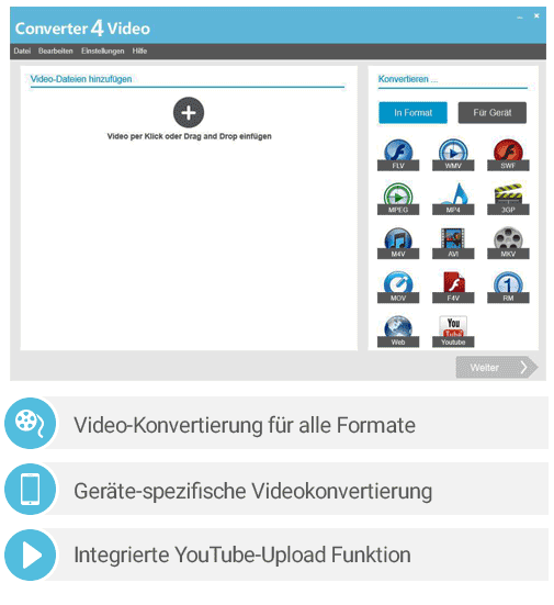 Das Problem ist in den meisten Fällen ein Dateiformat, das nicht von allen Geräten unterstützt wird.Dieses Problem löst Converter4Video 2016 sehr zuverlässig. Mit unserem cleveren Programm wandeln Sie Videos schnell und ohne Vorwissen per Mausklick um. Sie müssen sich nicht um passende Codecs und technische Details kümmern oder wissen welches Format von Ihrem Gerät unterstützt wird.