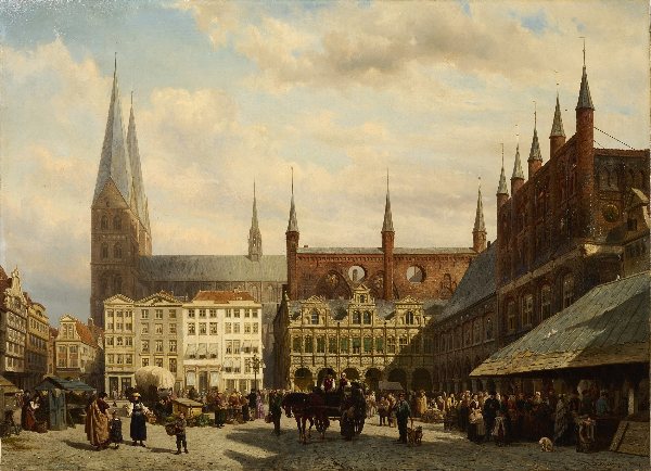 Ende März nahm die Lübecker Bürgerschaft das Schenkungsangebot an, nun ist es offiziell: Das Ölgemälde „Markt mit Rathaus und Marienkirche“ des niederländischen Malers Cornelis Springer aus dem Jahr 1870 kehrt wieder ins Museum Behnhaus Drägerhaus zurück. Das Gemälde befand sich bereits von 1940 bis 2004 im Besitz des Museums. Dann wurde es als NS-Raubkunst identifiziert und an die Erben des rechtmäßigen Besitzers Viktor von Ephrussi restituiert. Über eine Auktion bei Sotheby’s in London gelangte es damals in eine deutsche Privatsammlung, aus der es nun zum Verkauf angeboten wurde. Ein Mäzen erwarb das Gemälde in vorheriger Absprache mit dem Museum Behnhaus Drägerhaus und dem Bürgermeister der Hansestadt Lübeck und schenkte es dem Museum. Durch diese großzügige Schenkung ist nun der dauerhafte Verbleib dieser bedeutenden Lübecker Stadtansicht im Museum Behnhaus Drägerhaus gesichert. Das Bild wird nach der Wiedereröffnung des Museums am 25. Juli in einem eindrucksvollen Dreiklang von Lübeckansichten internationaler Künstler zu sehen sein: Zusammen mit dem Gemälde „Alte Häuser“ (1931) des Amerikaners Lionel Feininger sowie dem Gemälde „Jakobikirche in Lübeck“ (1958) des Österreichers Oskar Kokoschka veranschaulicht es, wie Maler von außerhalb Lübecks in unterschiedlichen Epochen auf die Hansestadt blickten.