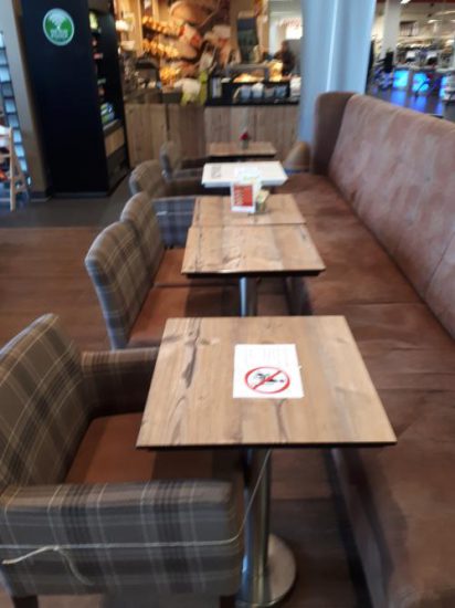 Die Mitarbeiter müssen echt ständig achtsam sein, denn immer wieder setzen sich Kunden falsch hin, oder rücken sich zu sehr auf den Leib, halten also die ca 2-Meter-Regel nicht ein.